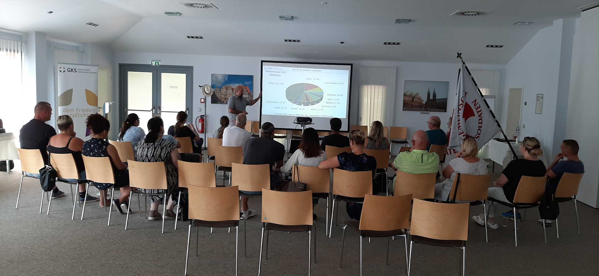 Der Samstagmorgen wurde zunächst mit einem Morgenlob durch F. Nowak eingeleitet bevor es mit den Arbeitseinheiten losging. Aufgrund der aktuellen weltpolitischen Lage wurde das gewählte Thema, „Problematik des globalen Waffentransfer mit besonderem Blick auf die Bundeswehr und die Ukraine“, mit Spannung erwartet. Als Referent konnten wir zu dem sehr komplexen und tiefgreifendem Thema Major Laurentius Wedeniwski gewinnen. Als Dezernent für Waffentransfer im Zentrum für Verifikationsaufgaben der Bundeswehr ist er u.a. für die Bewertung von Rüstungsgüter/Waffen, insbesondere deren Transfers zuständig. Mit diesem Hintergrund und seiner langjährigen Erfahrung wurde eine sehr weitreichende Betrachtung der Thematik auf dem quer durch den globalen Welthandel stattfindenden Waffentransfer dargestellt. Es wurden erwartungsgemäß viele Fragen gestellt, die alle mit praktischen Beispielen bestückt, zur vollsten Zufriedenheit beantwortet werden konnten.